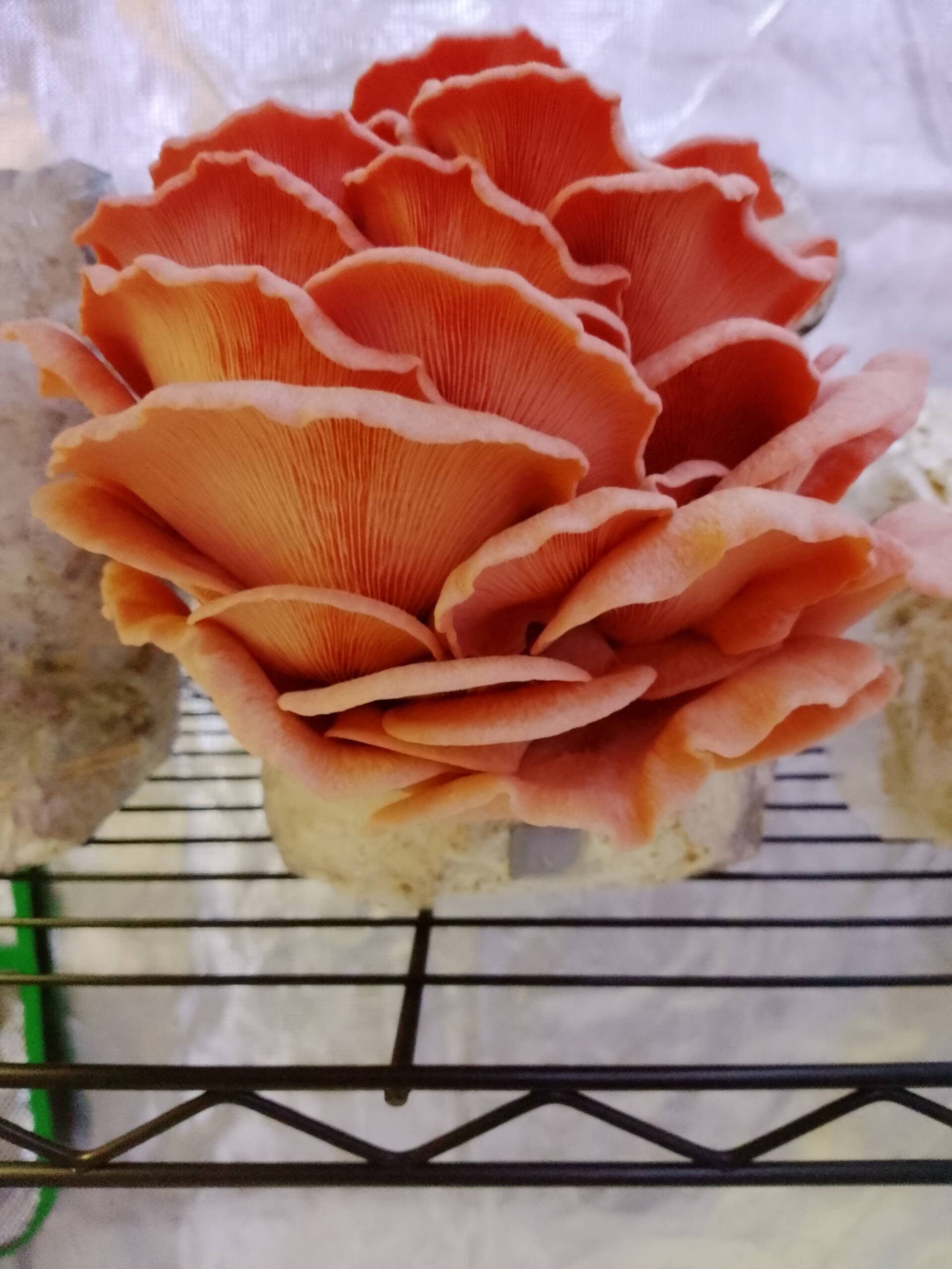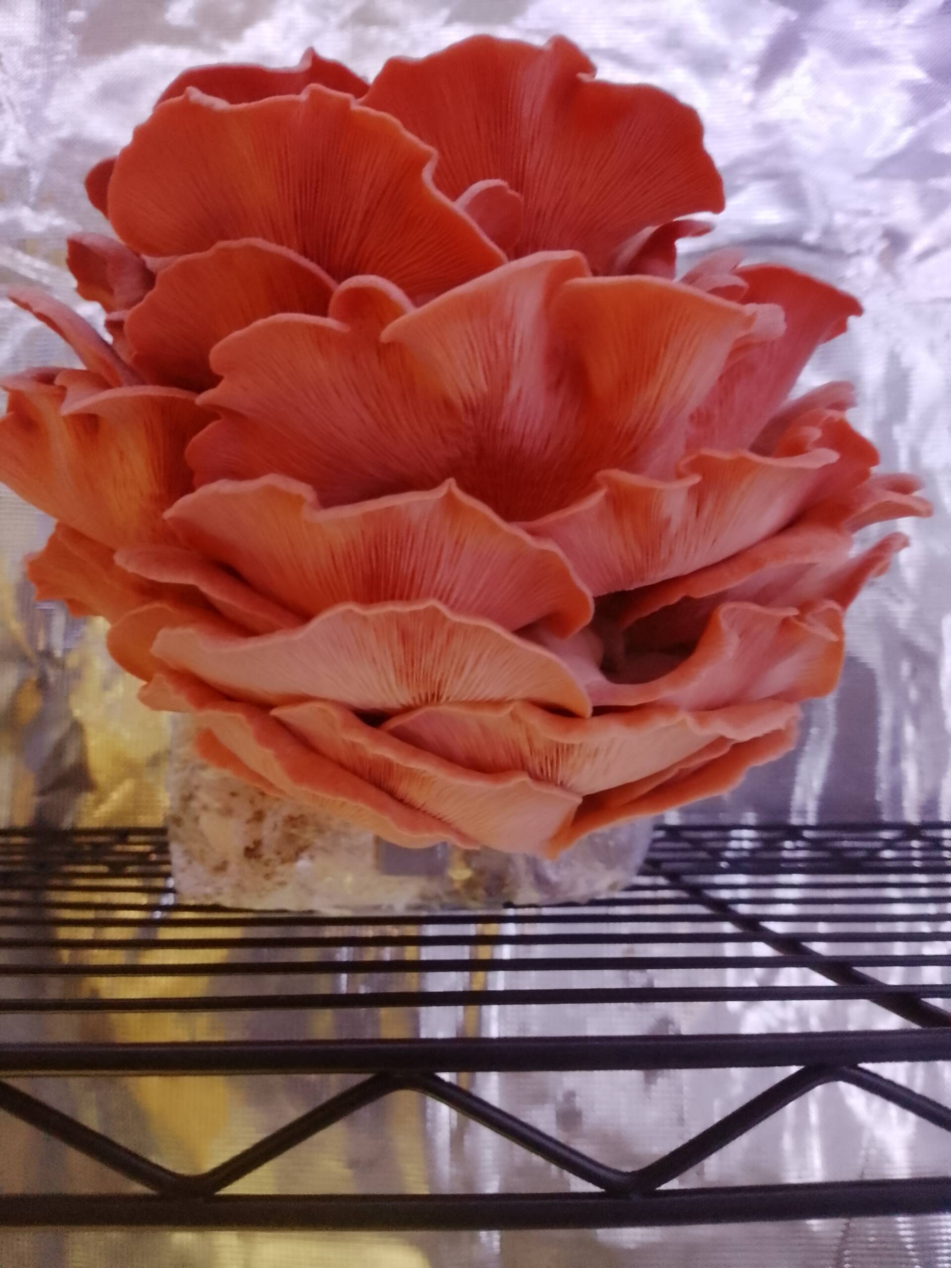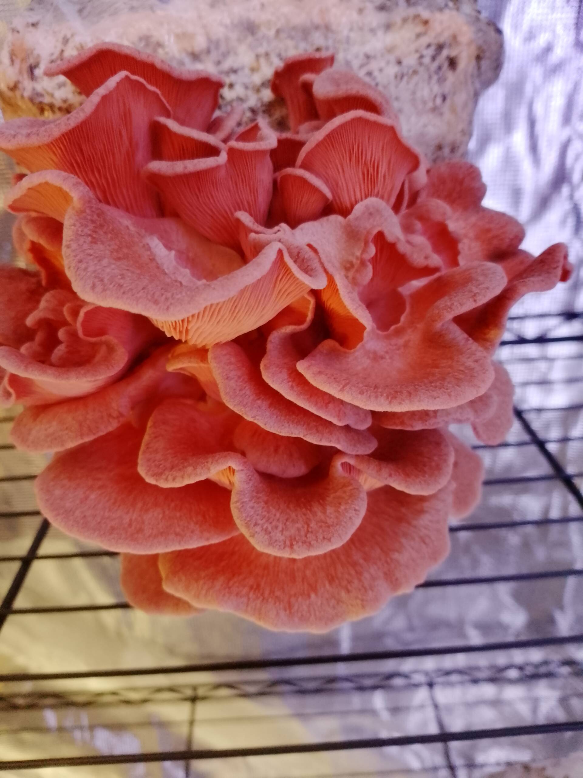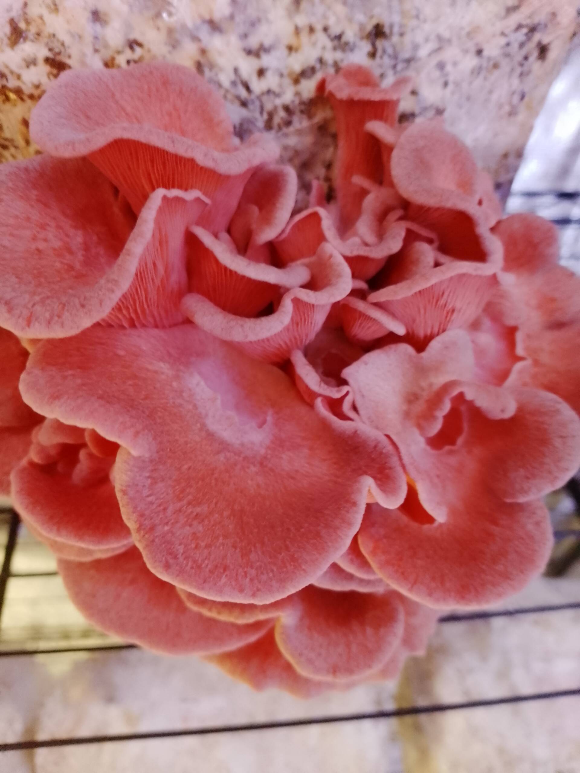 Fastest colonizer. Bold bacon-like flavor when cooked crispy. Pleurotus djamor is one of the most beginner-friendly gourmet mushrooms to cultivate.